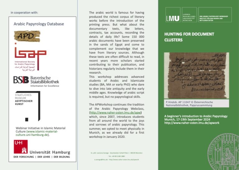ادمین وبسایت طومار اندیشه - ۱۴۰۳/۰۳/۱۷ فراخوان کارگاه پاپیروسشناسی عربی، دانشگاه مونیخ، آلمان دانشگاه مونیخ دومین کارگاه پاپیروسشناسی عربی را با موضوع «شکار خوشههای اسناد» برگزار می کند. علاقمندان تا 10 تیر برای...